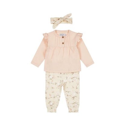 Lichtroze shirt met een beige broekje met een print van bloemetjes en eendjes. Dit is een set met een haarband in dezelfde print.