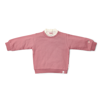 Oudroze pointelle rib longsleeve met een bloemetje op de voorkant en een kraagje.