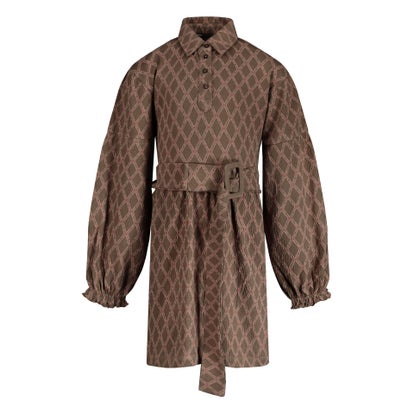Taupe kleurige jurk met lijnen. De jurk heeft wijdere mouwen en een ceintuur.