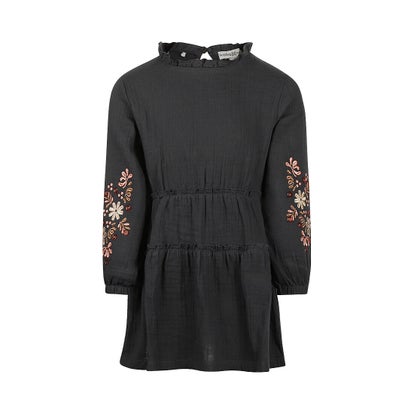 Zwarte jurk met een hoog halsje. Op de mouwen geborduurde bloemen met pailletjes.