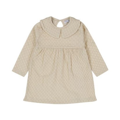 Beige/grijze jurk met een mooie motief in de print. De jurk is voorzien van een kraagje.