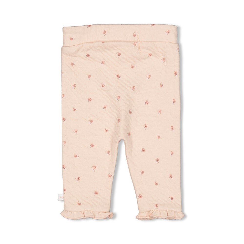 Lichtroze broek met een bloemetjesprint. Onderaan een kleine ruffle.