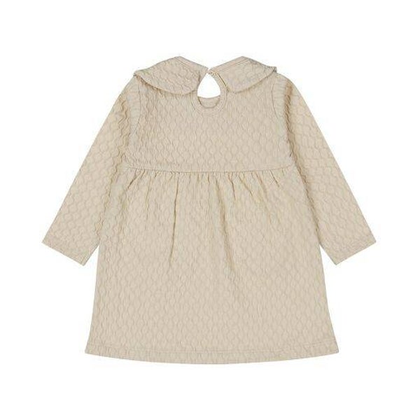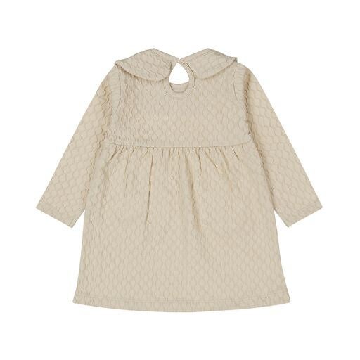 Beige/grijze jurk met een mooie motief in de print. De jurk is voorzien van een kraagje.
