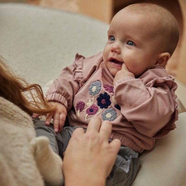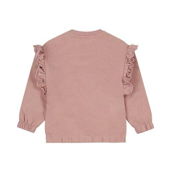 Oudroze sweater met lage schouders met een klein randje eraan. Op de voorkant gekleurde bloemen.