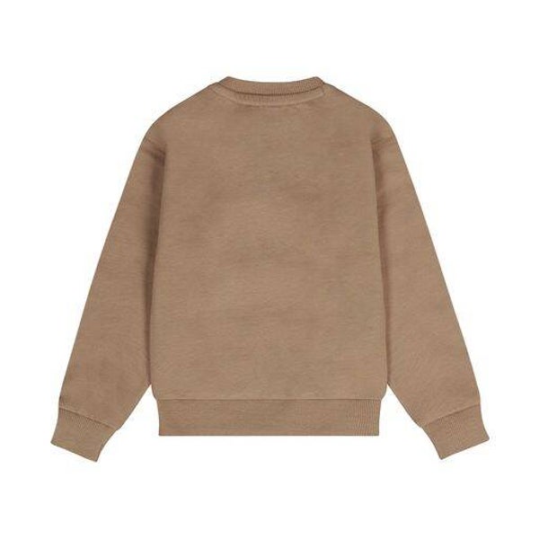 Taupe kleurige sweater met diverse emblemen op de voorkant.
