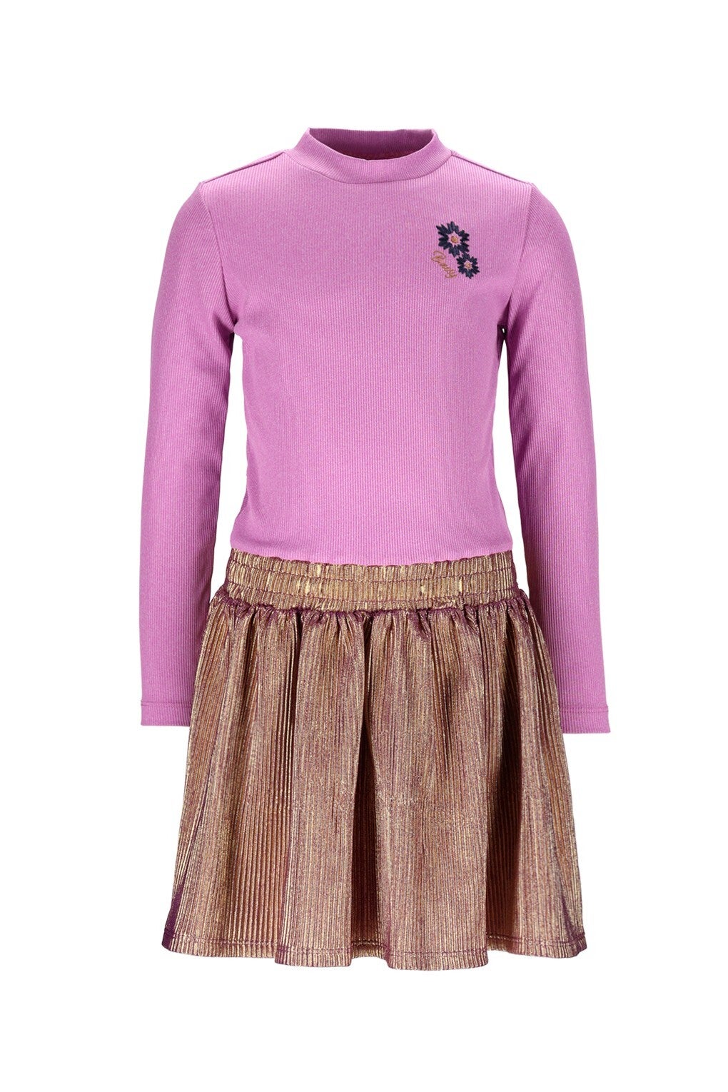 De bovenkant is een lila rib stof en de rok van de jurk is een gouden metallic stof.