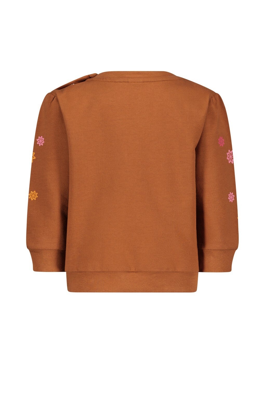 Bruine sweater met bloemen op de mouwen.
