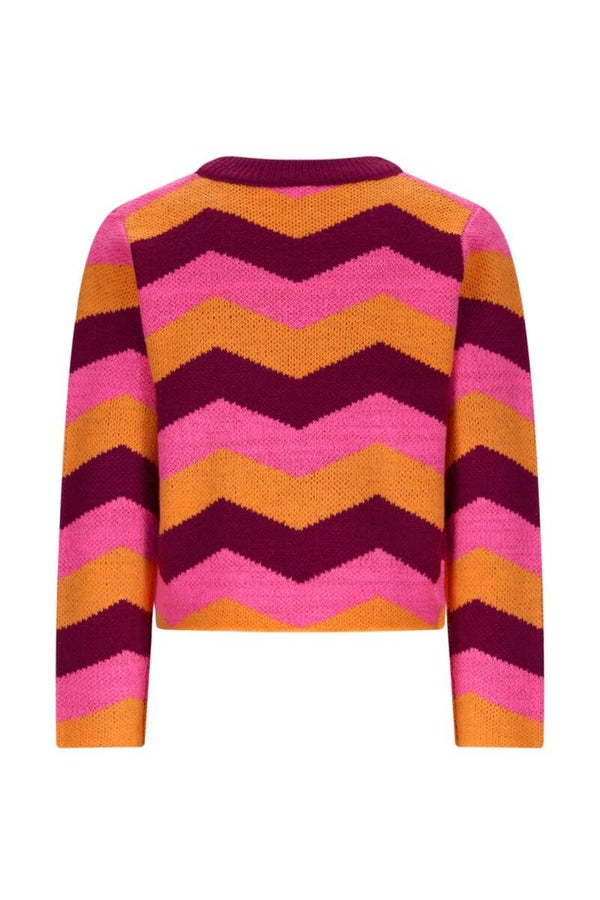 Gebreide sweater met een zigzag print in bordeaux, oranje en roze.