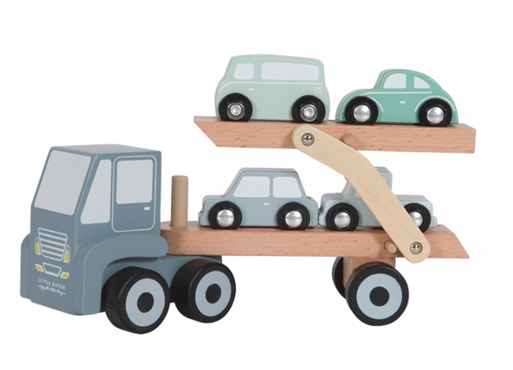 De Little Dutch houten truck met oplegger inclusief 4 auto’s ontgaat je kleintje niet als hij voorbij komt rijden! Klap de oplegger uit en de autootjes kunnen er vanaf roetsjen. Deze truck houdt je kleintje wel even bezig en maakt de autocollectie thuis compleet.