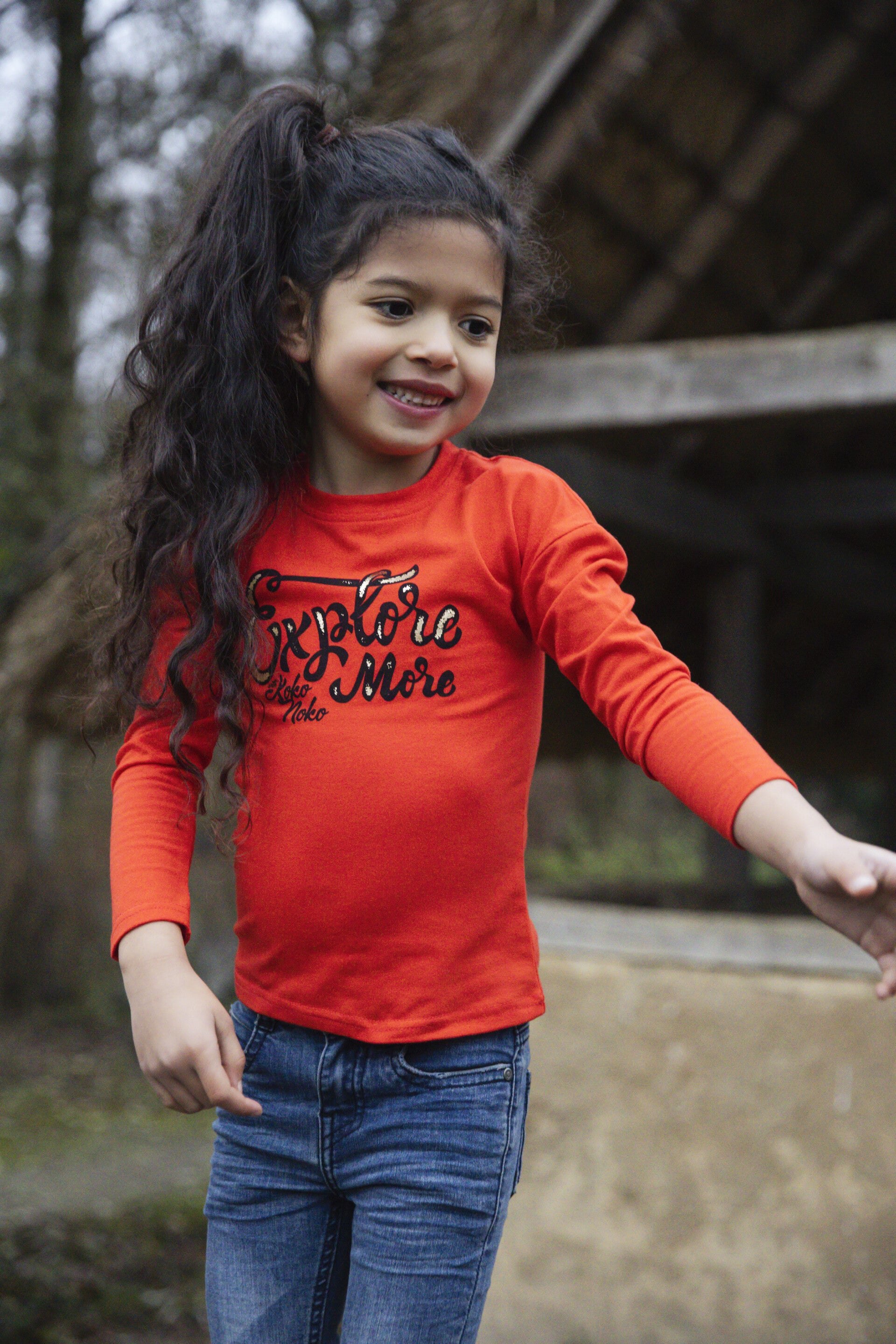 Rood shirt met op de voorkant in zwarte letters 'Explore More' met gouden glitters erdoor.