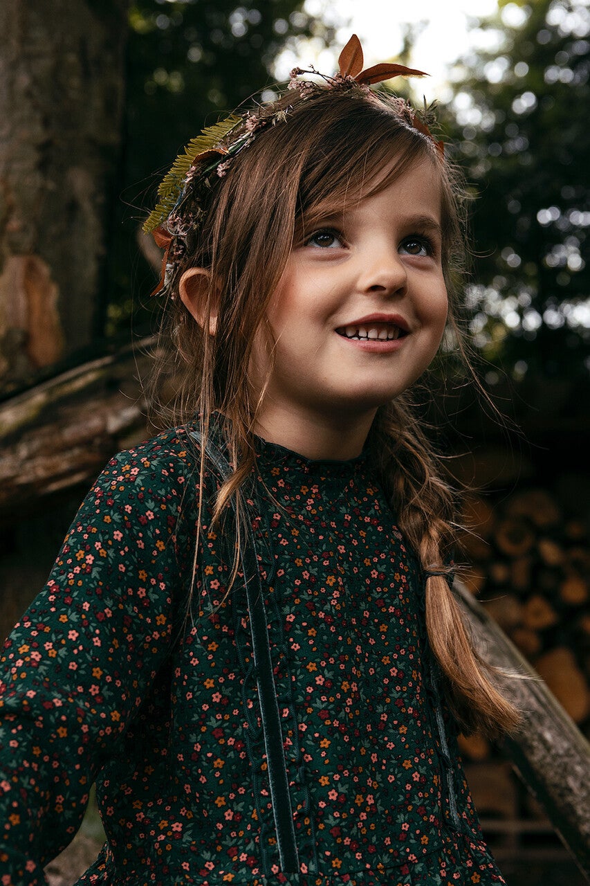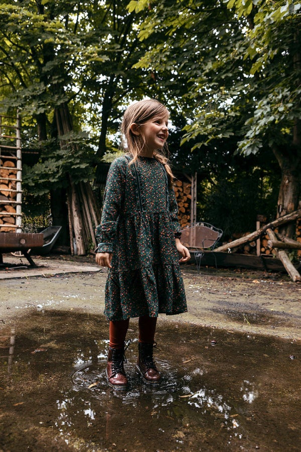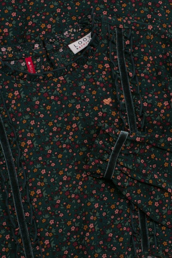 Groene jurk met een bloemetjes print. De jurk is mooi afgewerkt met een geribbeld randje bij de hals en over de voorkant met satijnen strookjes. Ook aan het uiteinden van de mouwen een satijnen strookje.