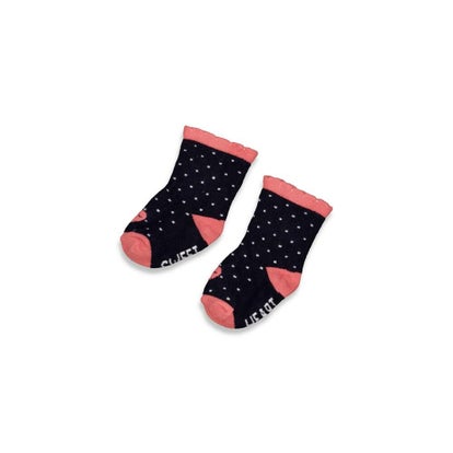 Donkerblauwe sokken met witte stipjes. Op de bovenkant een roze hartje en roze stukken.