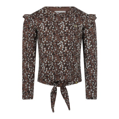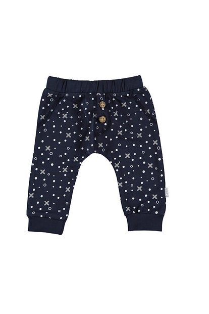 Donkerblauw broekje met een print met witte kruisjes en rondjes. Dit broekje is heerlijk comfortabel! Op de voorkant heeft het broekje 2 bruine knoopjes.