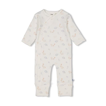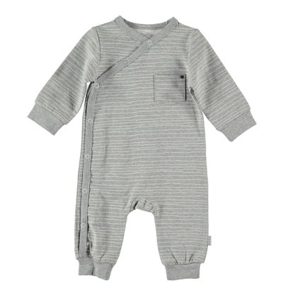 Grijs boxpakje met handige drukknoopjes aan de zijkant; van boven tot onder. Zo is dit pakje makkelijk aan en uit te doen bij je kleintje! Het boxpak heeft een print met fijne witte streepjes.