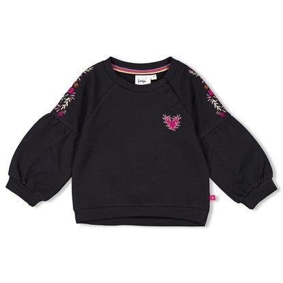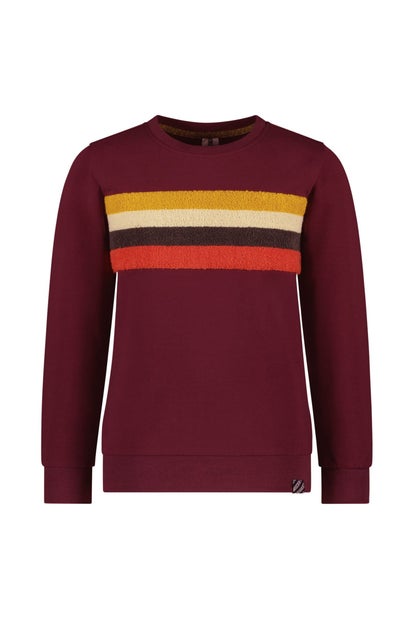 De sweater heeft een geribbelde kraag en een bewerkt breisel