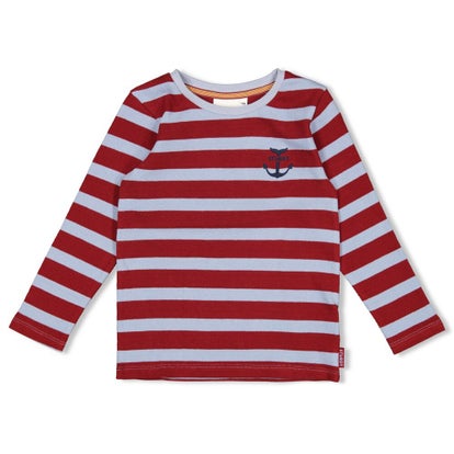 Bordeaux met lichtblauw gestreepte longsleeve. De longsleeve heeft een fijne rib stof.